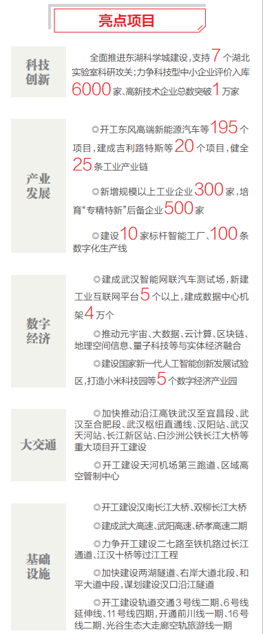 緊扣“實力雄厚”,大力推動高質(zhì)量發(fā)展:做大做強區(qū)級經(jīng)濟,著力提升“一主引領(lǐng)”輻射力,帶動武漢城市圈同城化發(fā)展,打造全國重要增長極。初步建成國家商貿(mào)物流中心、區(qū)域金融中心,加快打造長江流域和中部地區(qū)樞紐港、鐵路客貨運“雙樞紐”、航空客貨運門戶“雙樞紐”,發(fā)揮自貿(mào)區(qū)帶動作用,全面提速國際交往中心建設(shè)。