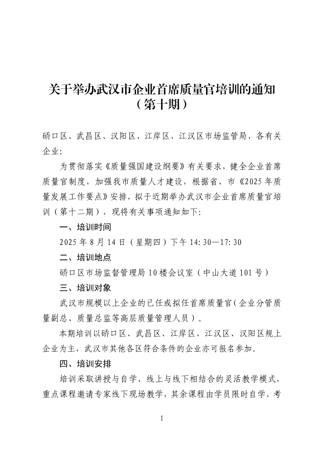 關于舉辦武漢市企業(yè)首席質量官培訓的通知(第十期)