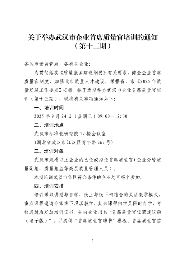 關(guān)于舉辦武漢市企業(yè)首席質(zhì)量官培訓的通知(第十二期)